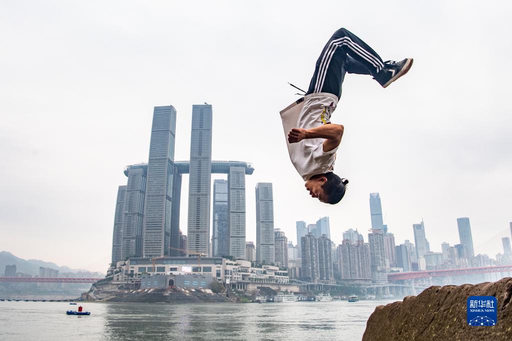 2023年4月21日,重慶躍飛跑酷隊員文舜堯在重慶朝天門對岸的江灘上展示跑酷動作。