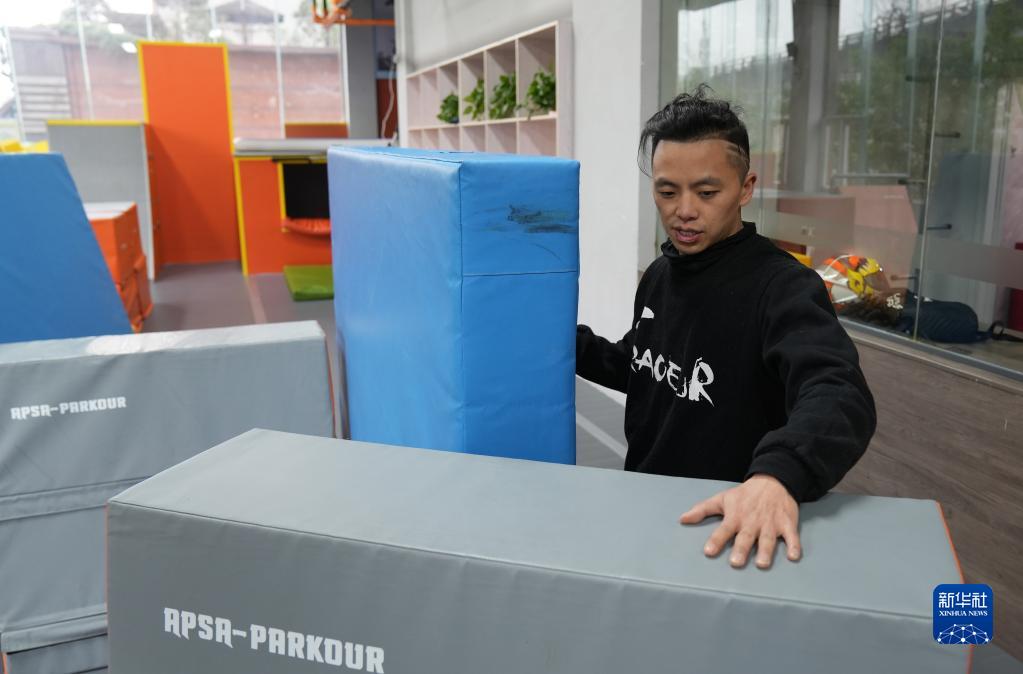 2023年2月23日,文舜堯在重慶躍飛跑酷俱樂部內擺放訓練器材。
