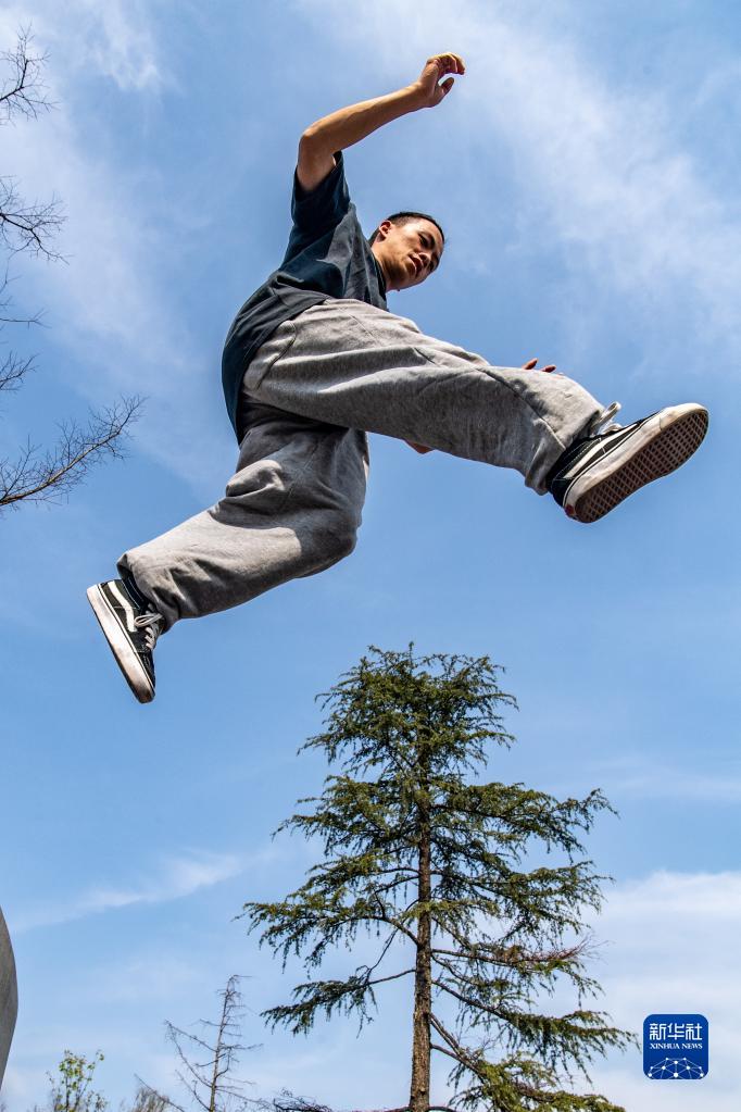 2023年3月14日,重慶躍飛跑酷隊員文舜堯在重慶金州公園嘗試新設計的跑酷路線。