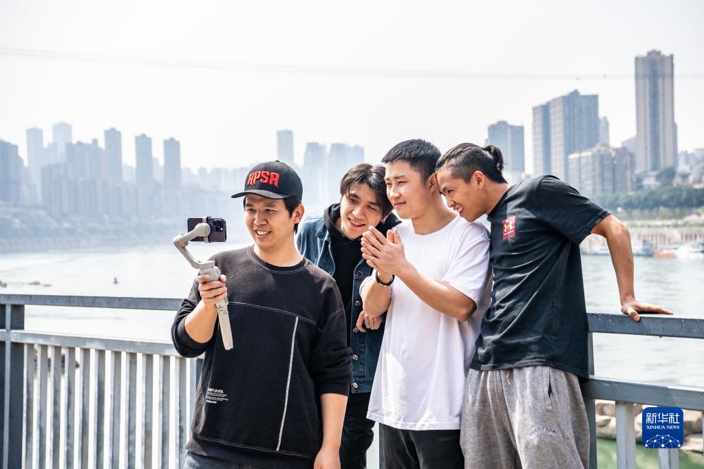 2023年3月14日,在重慶東水門長江大橋下的濱江路,文舜堯(右一)和重慶躍飛跑酷隊員們回看拍攝的跑酷視頻。