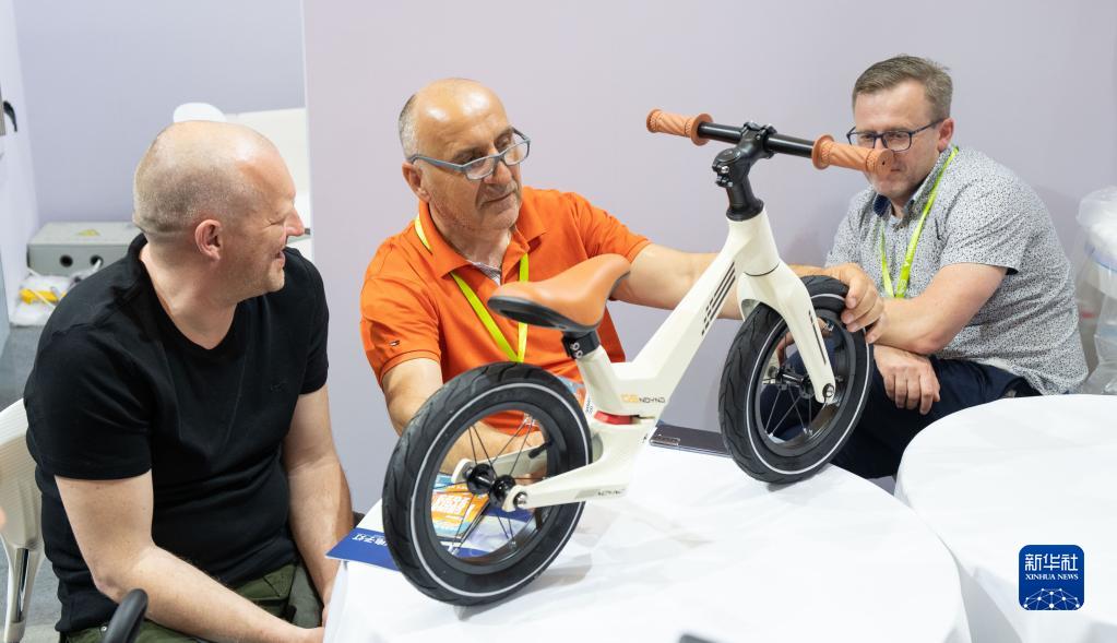 5月5日,在第31屆中國國際自行車展覽會上,波蘭客商在觀看童車。