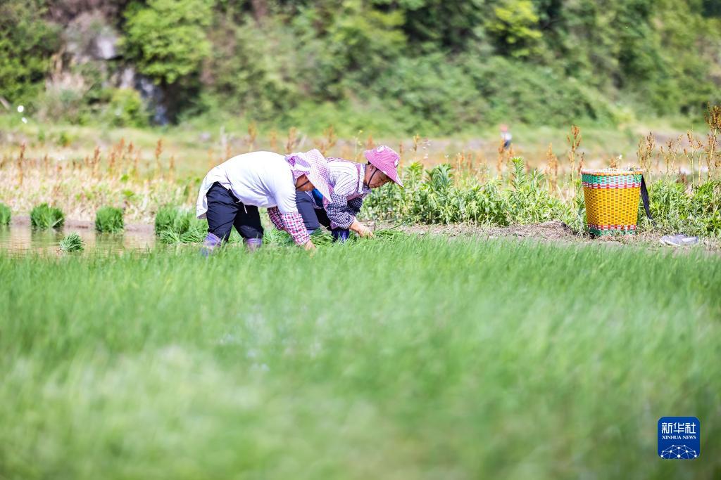 5月5日,農民在貴州省安順市西秀區雞場布依族苗族鄉石井村田間插秧。