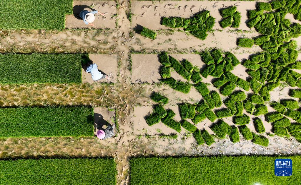 5月5日,農民在四川省南充市蓬安縣睦壩鎮虹管村稻田里起秧(無人機照片)。