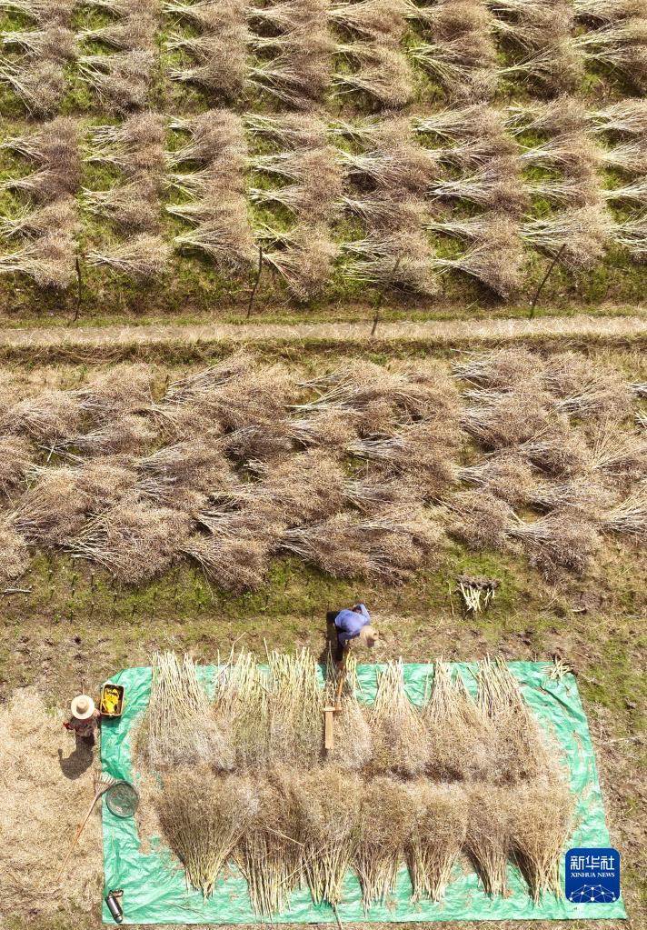5月4日,在湖南省衡陽市衡東縣楊林鎮,當地村民在采收油菜籽(無人機照片)。