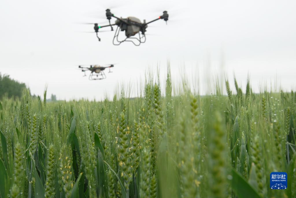 5月5日,山東省青島市即墨區移風店鎮徐家溝村,無人機在田間進行協同噴灑作業。