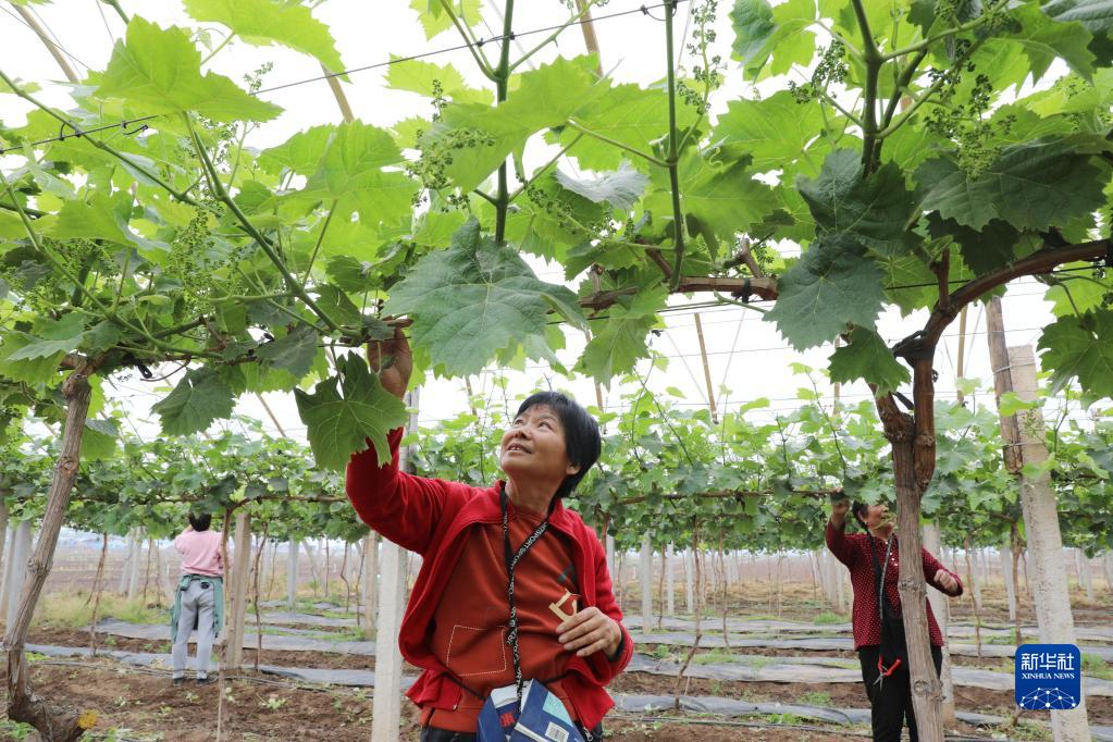 5月5日,河南省焦作市溫縣番田鎮后楊壘村農民在田間管理葡萄。