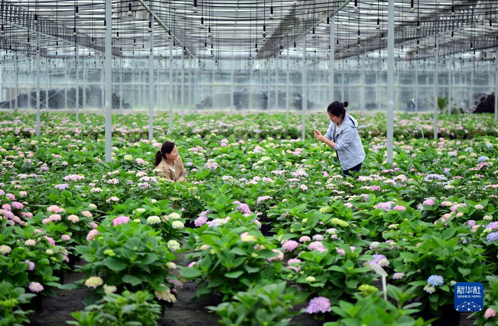 5月5日,在肥西縣經開區一家農林科技企業,市民在花卉種植大棚內留影。