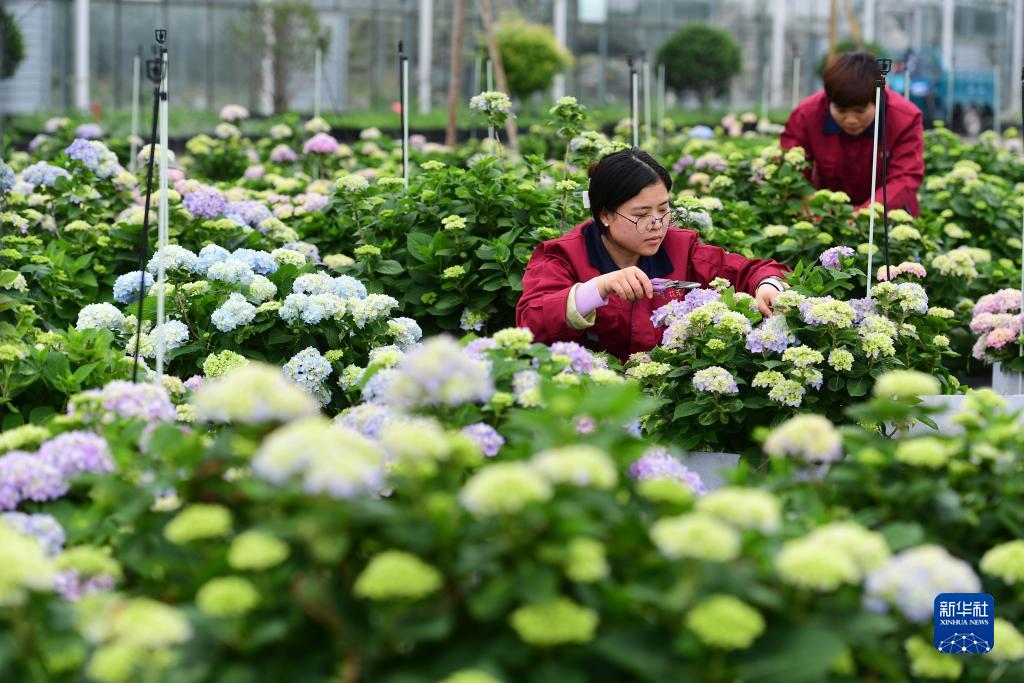 5月5日,在肥西縣經開區一家農林科技企業,員工在花卉種植基地打理繡球花。