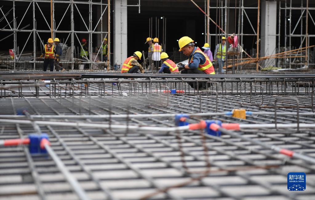 5月5日,在廣州黃埔區的中山大學附屬第三醫院嶺南醫院二期項目,工人在捆扎鋼筋。