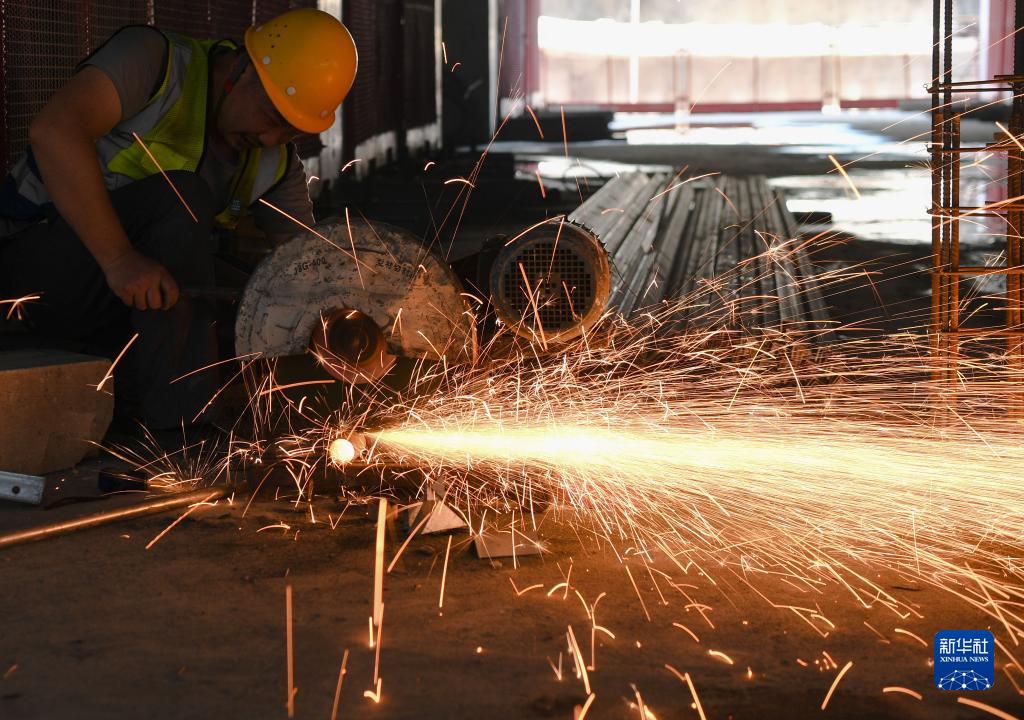 5月5日,在廣州黃埔區的中山大學附屬第三醫院嶺南醫院二期項目,工人在切割鋼管。