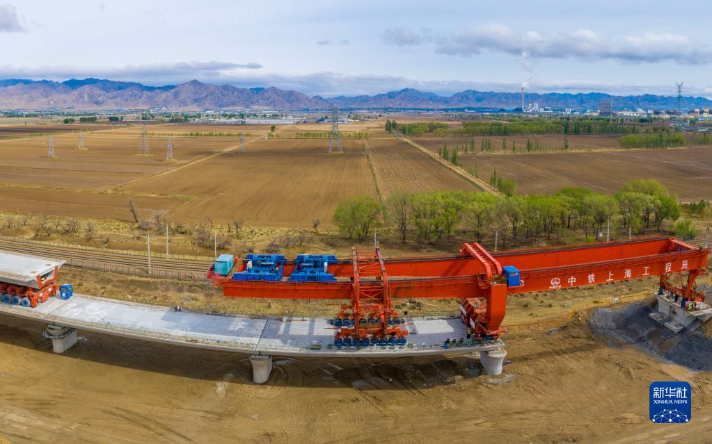5月5日拍攝的包銀高鐵跨萬甘鐵路特大橋箱梁架設施工現場(無人機照片)。