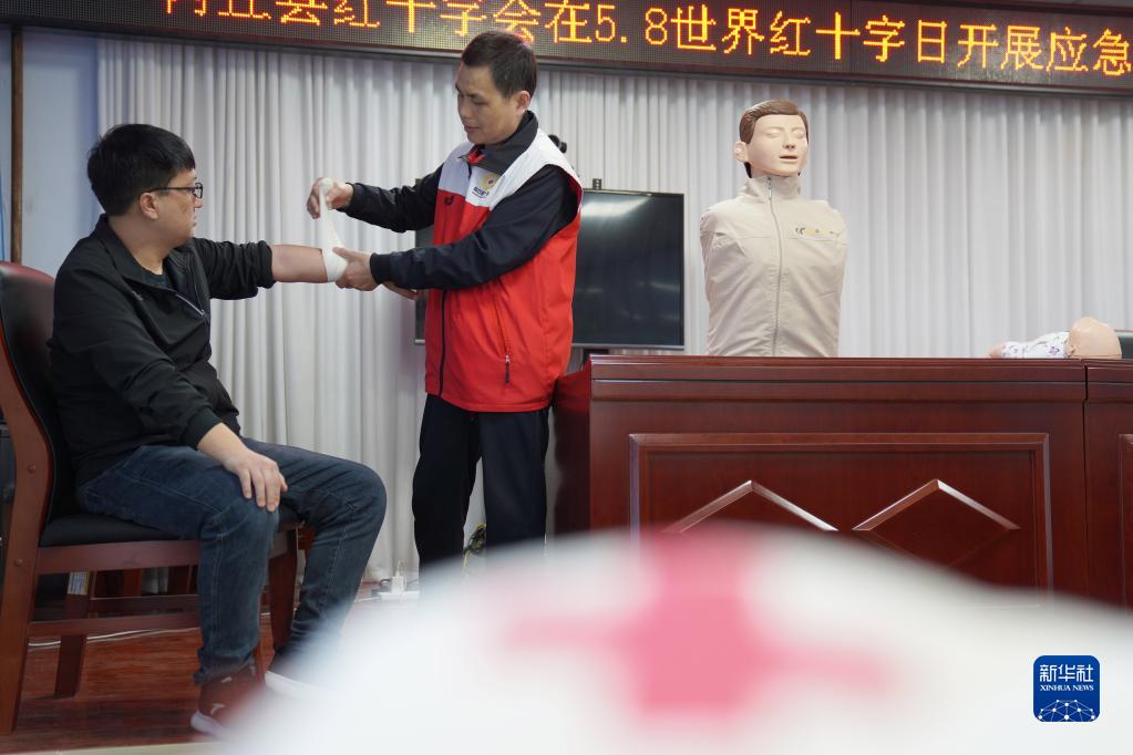 5月5日,學員在內丘縣紅十字會培訓教室學習外傷包扎知識。