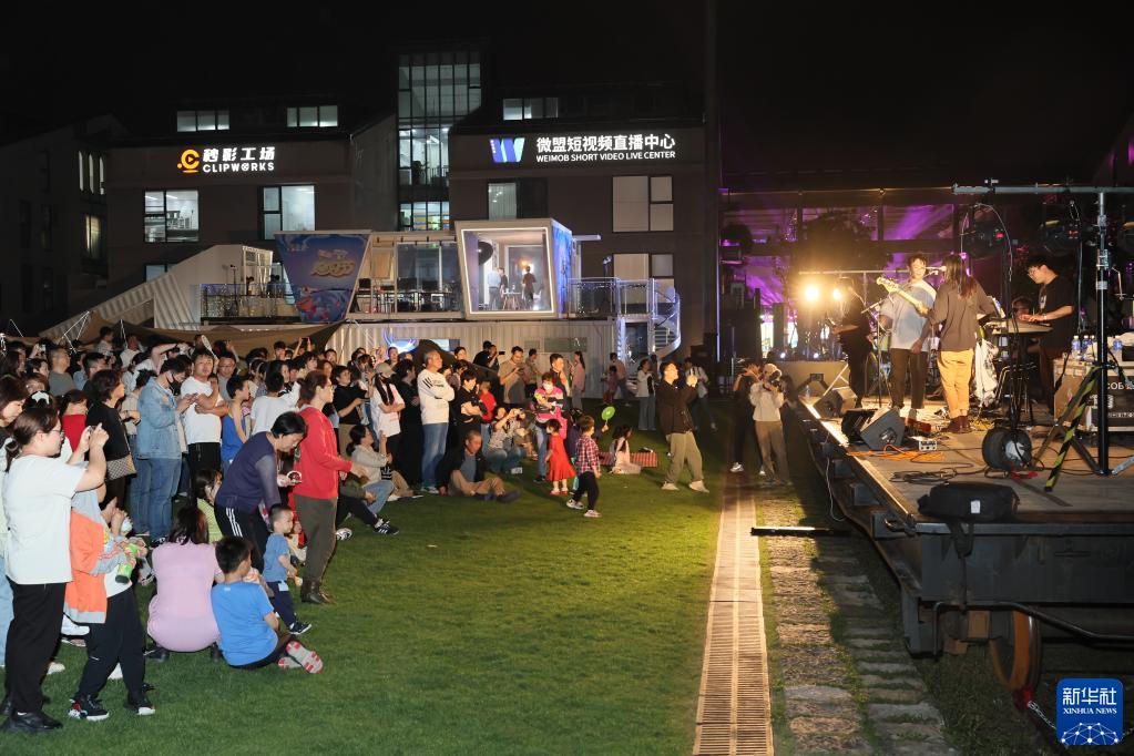 5月5日,市民在上海市寶山區中成智谷觀看露天樂隊演奏。