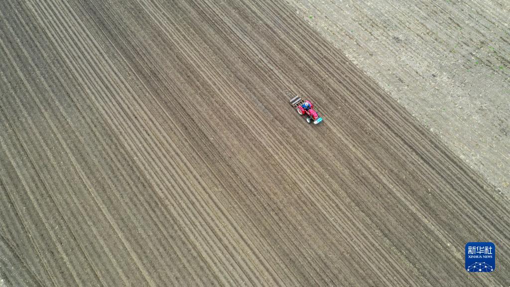 5月5日,在吉林省長春市九臺區龍嘉街道水鄉村,農民駕駛農機進行春耕作業(無人機照片)。