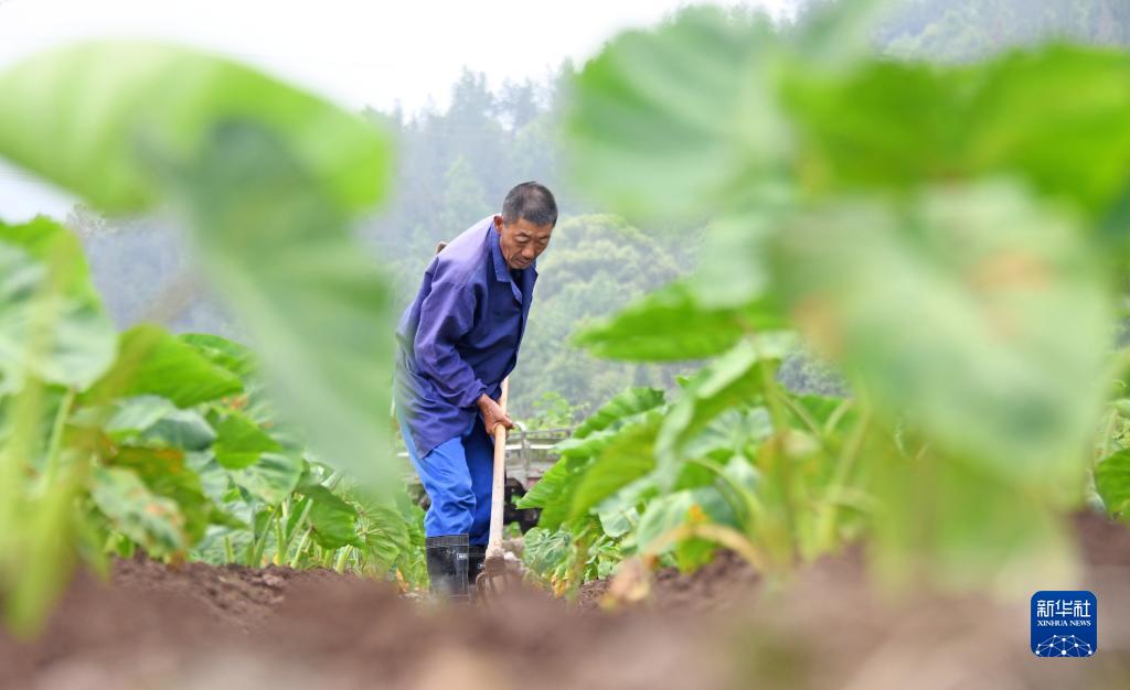 5月6日,農民在浙江省臺州市仙居縣白塔鎮和塘村田園里給種植的芋頭培土、除草。
