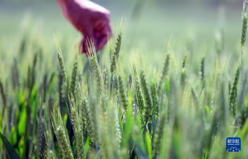 5月6日,山東省臨沂市郯城縣郯城街道的農民在查看小麥長勢。