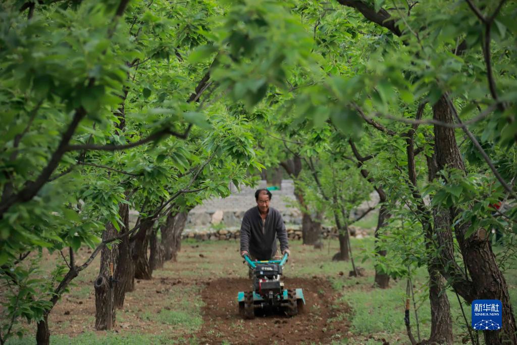 5月6日,河北省遵化市西下營滿族鄉雙義村農民在栗樹果園旋耕土地。