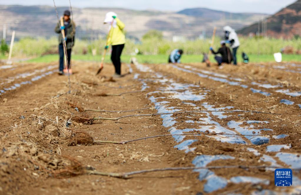 5月6日,農民在甘肅省平涼市靜寧縣城川鎮靳寺村果園地里栽種蘋果樹苗。