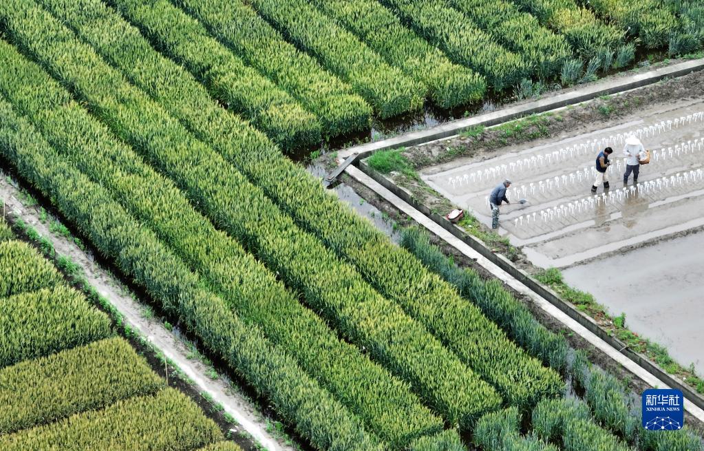 5月6日,在江蘇里下河地區農科所(揚州市農科院),農民在試驗田勞作(無人機照片)。