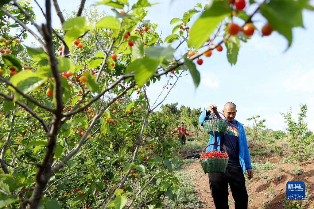 5月6日,山東省青島市西海岸新區鐵山街道楊家山里片區的農民搬運采摘的櫻桃。