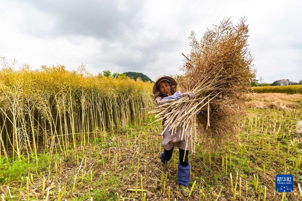 5月6日,農民在貴州省安順市西秀區大西橋鎮鮑家屯村田間采收油菜籽。