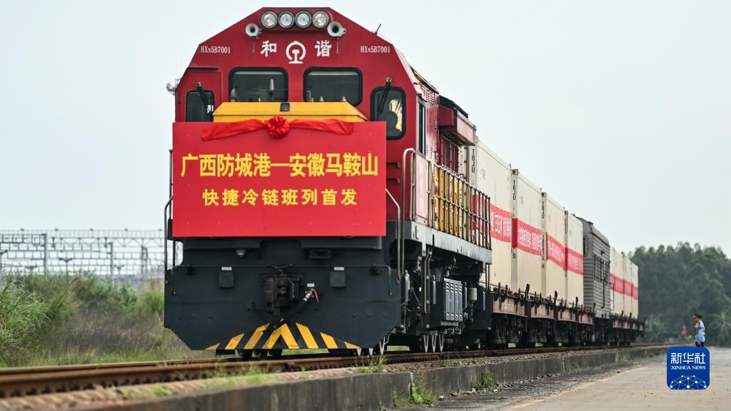 5月6日,搭載8個冷鏈集裝箱的列車從廣西防城港站發車,前往安徽馬鞍山站。