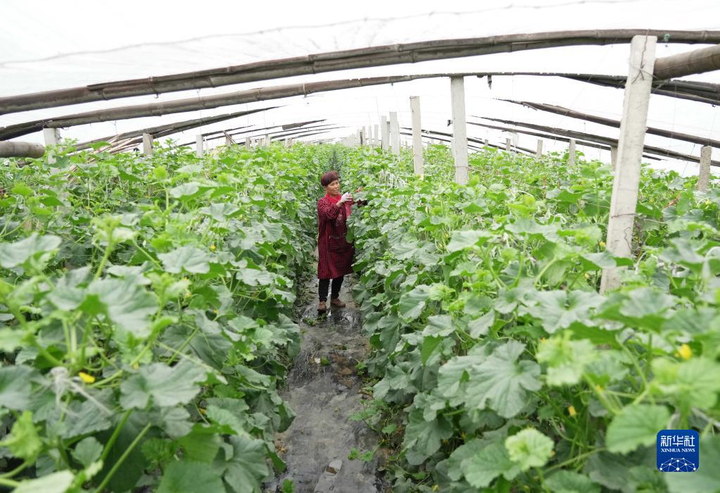 5月6日,河北省新樂市邯邰鎮小流村的一名果農在大棚內管護甜瓜。