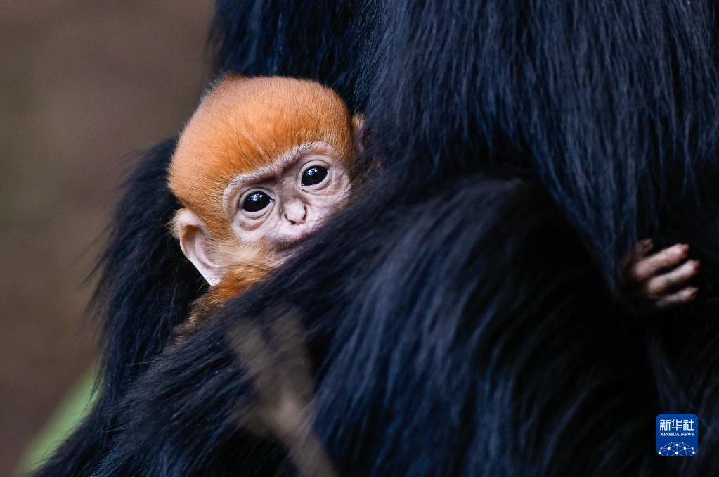 在貴州麻陽河國家級自然保護區拍攝的黑葉猴幼猴。新出生的黑葉猴毛色呈金黃色,幾個月后逐漸變成黑色(4月30日攝)。