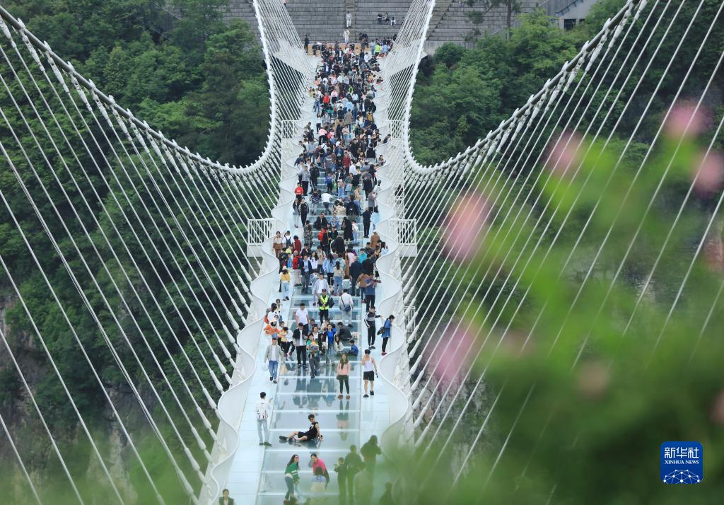 5月2日,游人在湖南張家界大峽谷風景區體驗高空玻璃橋。
