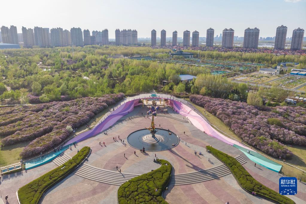 5月6日,游客在哈爾濱丁香公園賞花游玩(無人機照片)。
