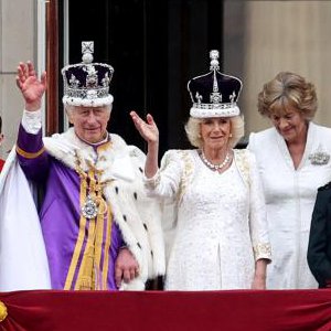 5月6日,在英國倫敦,英國國王查爾斯三世和王后卡米拉加冕后在白金漢宮陽臺向民眾揮手致意。