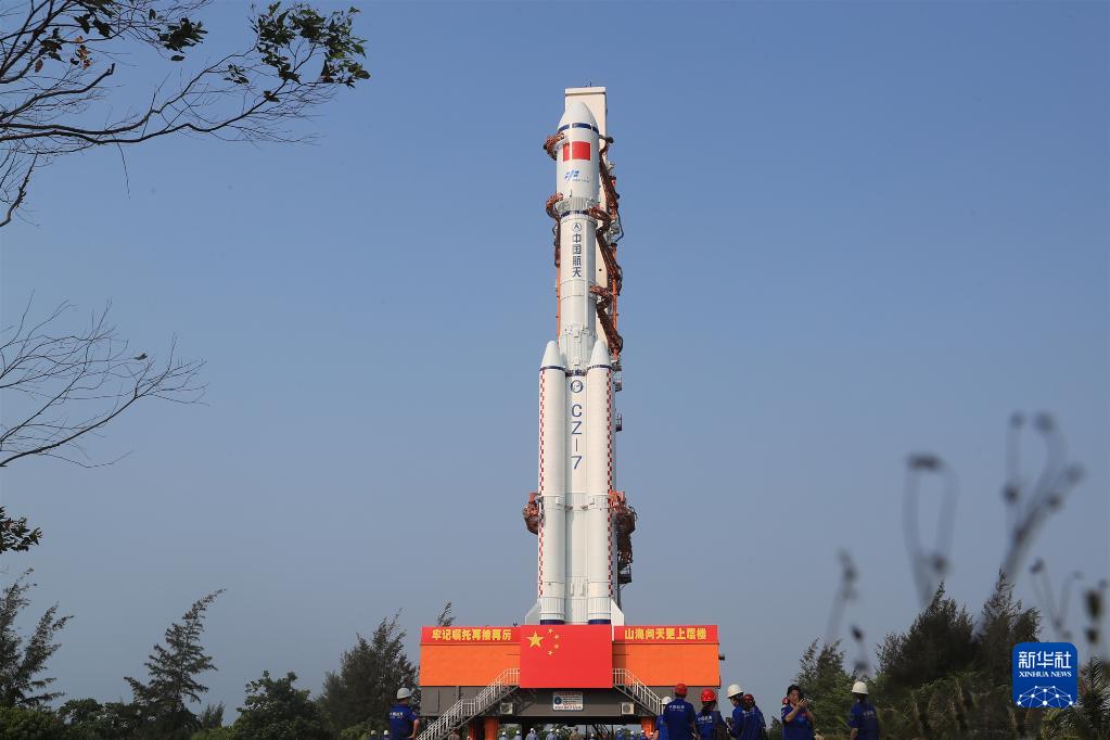 5月7日,天舟六號貨運飛船與長征七號遙七運載火箭組合體在垂直轉運中。