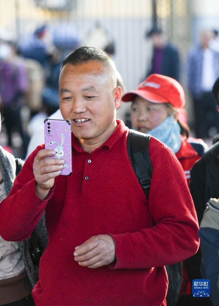 在綏化火車站站臺,乘客在等候K5151次列車時與親友視頻通話(5月6日攝)。