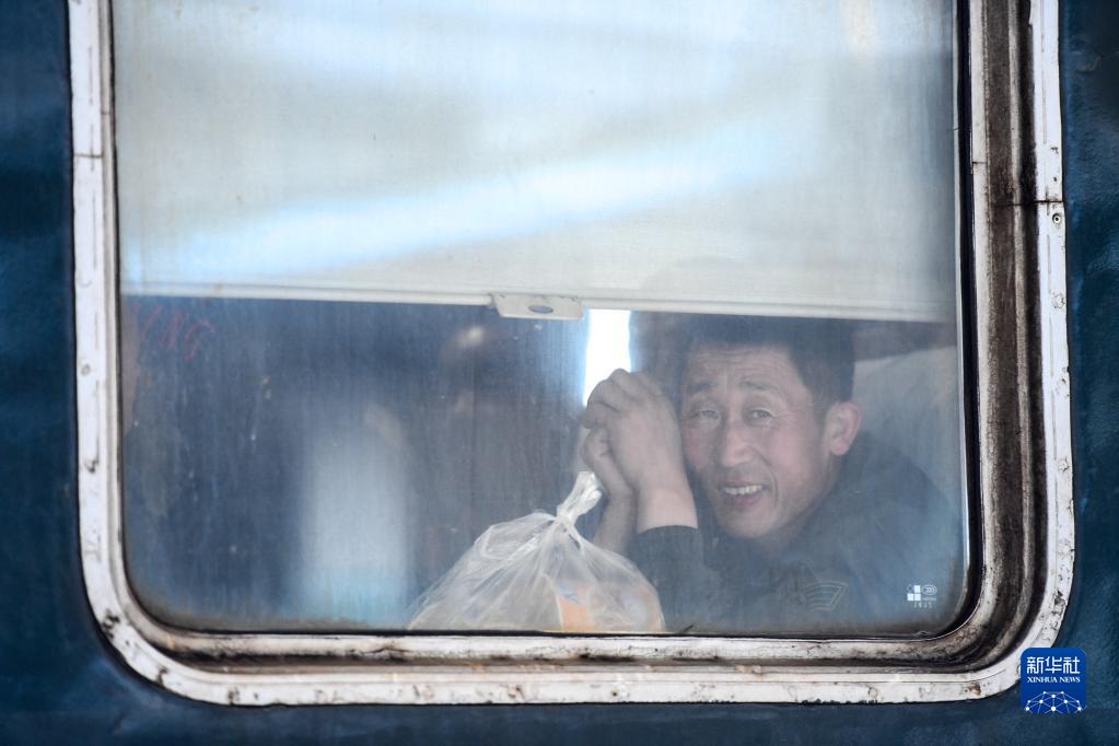在K5151次列車車廂中,一位乘客在座位上望向窗外(5月6日攝)。