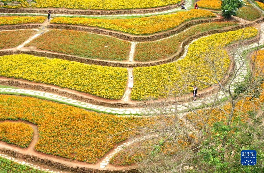 5月7日,游客在廣西南寧市青秀山風景區繽紛花田景點賞花(無人機照片)。