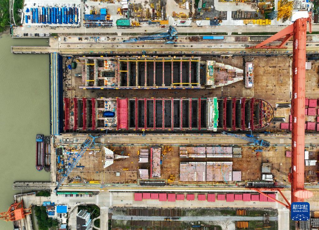 5月7日拍攝的揚州中遠海運重工有限公司3號船塢作業場景(無人機照片)。