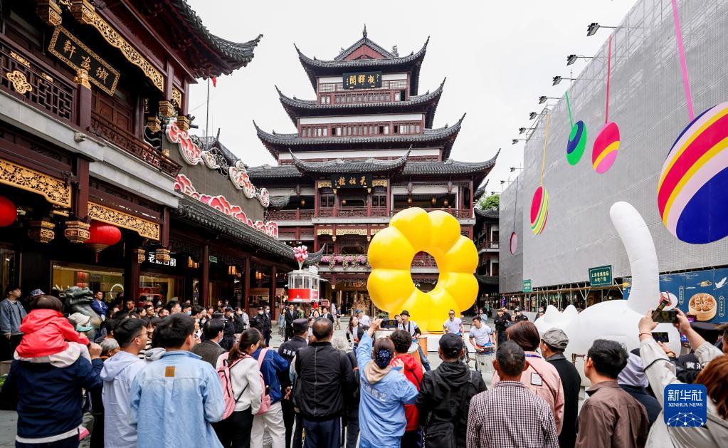 5月7日,市民游客在豫園商城中心廣場觀看街頭藝術表演。