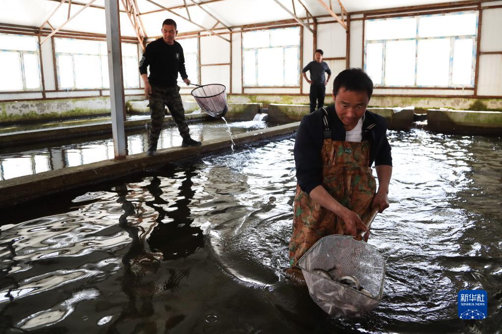 5月7日,養殖基地負責人耿海濤(前)在育苗區打撈細鱗鮭魚苗。