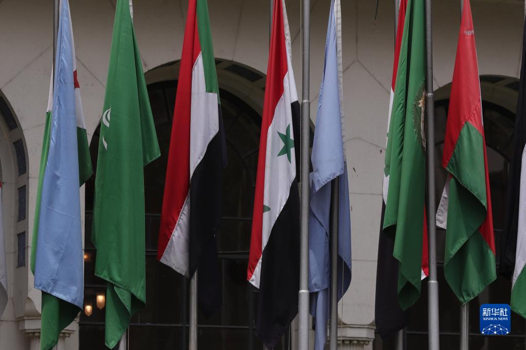 這是5月7日在位于埃及開羅的阿拉伯國家聯盟總部拍攝的敘利亞國旗(左四)。