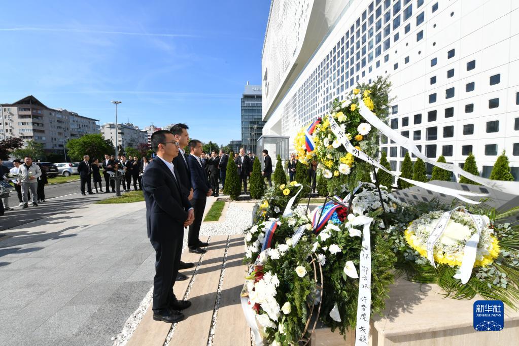5月7日,在塞爾維亞貝爾格萊德,中資企業代表在中國駐南斯拉夫聯盟大使館舊址前的烈士紀念碑前肅立。