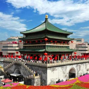 作為西安文化地標之一的鐘樓,位于西安市中心,城墻內東西南北四條大街的交匯處。昔日樓上懸一口大鐘,用于報警報時,故名“鐘樓”。鐘樓建在方形基座上,為磚木結構,是一座重檐三滴水式四角攢尖頂的閣樓式建筑,通高36米,面積1377.64平方米。樓設二層,每層飾有斗拱、藻井、木刻、彩繪等古典優美的建筑圖案。