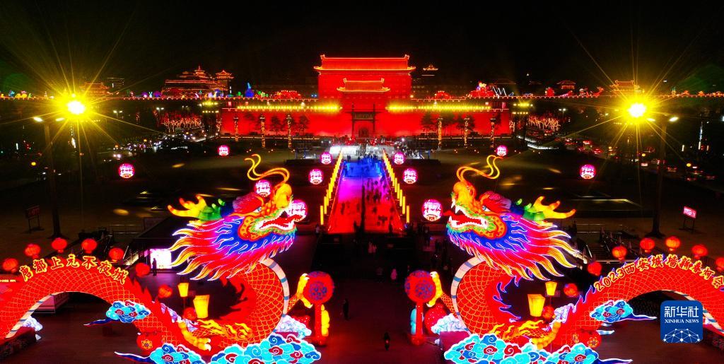 2023年春節期間西安城墻永寧門的花燈(1月26日攝,無人機照片)。