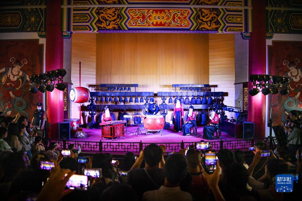游客在西安鼓樓內觀看演出(5月1日攝)。