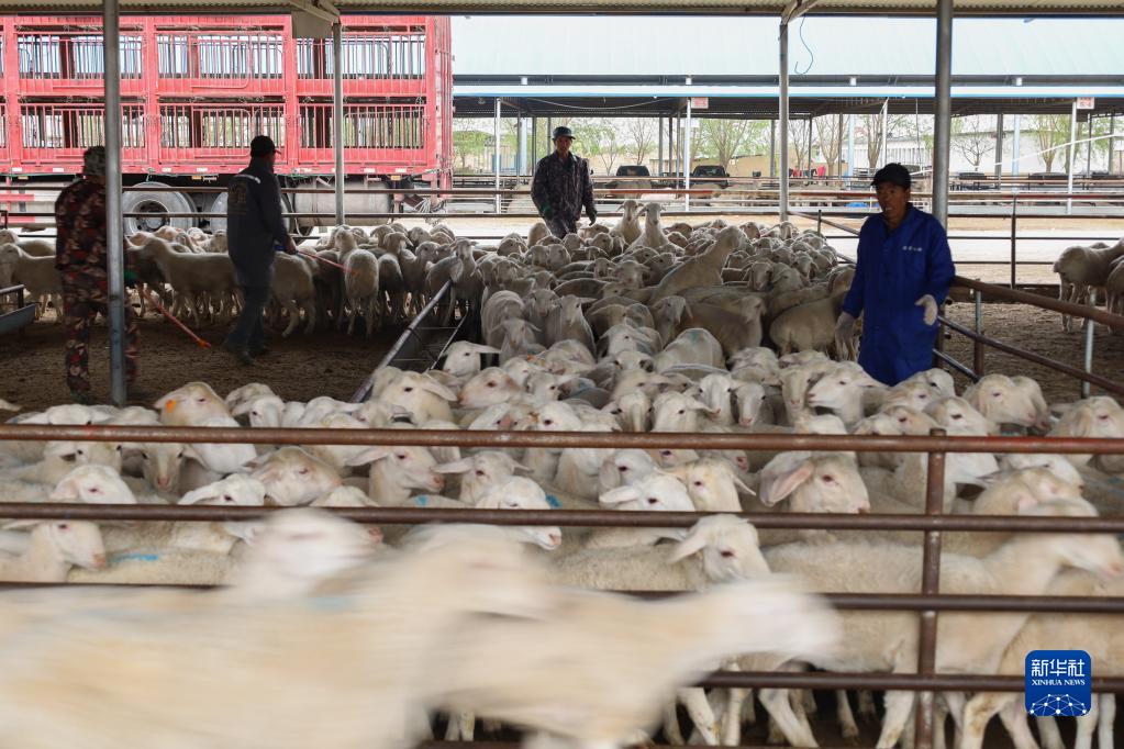 5月7日,在古浪森茂牛羊交易市場,工作人員趕羊裝車。