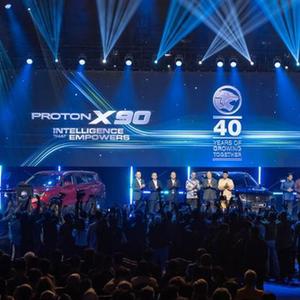 5月7日,來賓在馬來西亞吉隆坡舉行的寶騰新款車型X90發布儀式上合影。