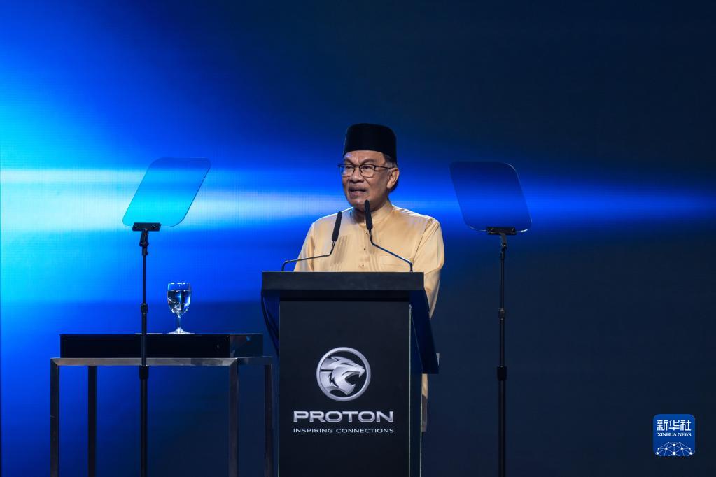 5月7日,馬來西亞總理安瓦爾在吉隆坡舉行的寶騰新款車型X90發布儀式上講話。