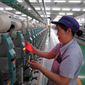 5月8日,工人在無錫一棉紡織集團長江車間生產線上工作。