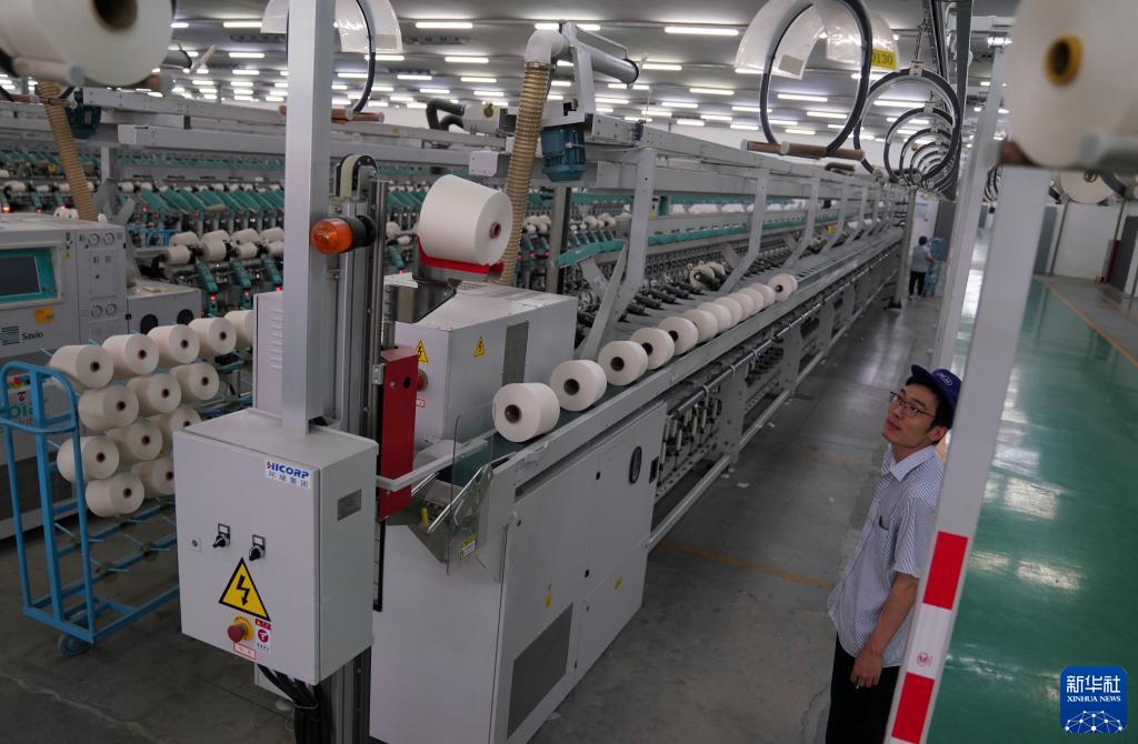 5月8日,在無錫一棉紡織集團揚子江車間,工人查看生產設備的運行狀態。