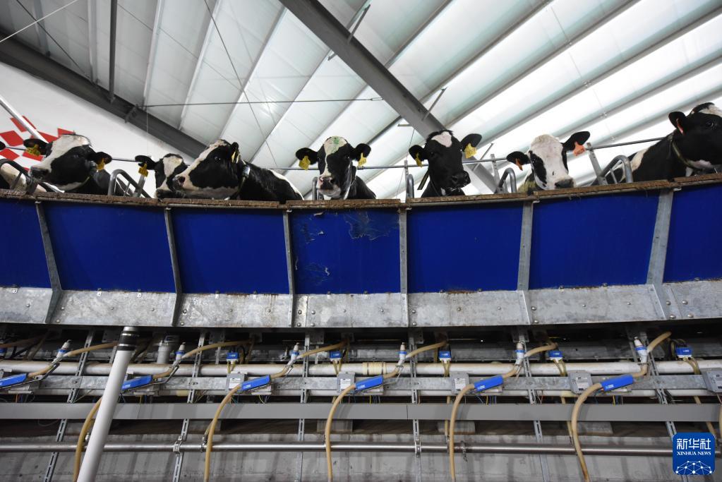5月7日,在甘肅武威金宇浩睿農牧產業園,奶牛在轉盤式擠奶機上產奶。