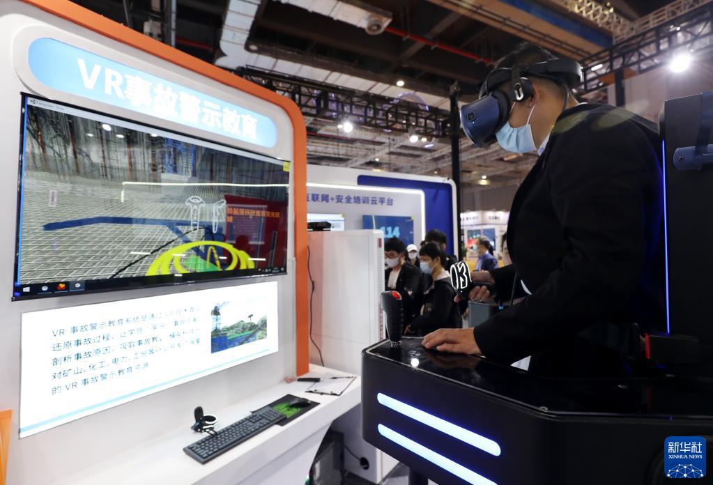 5月8日,參觀者在展會上體驗一款VR事故警示教育系統。